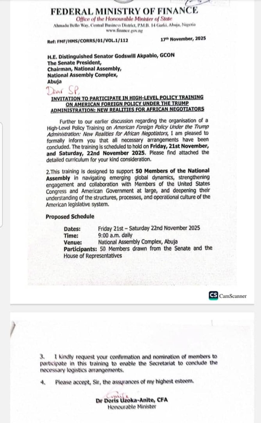 The memo, dated November 17, 2025, confirmed that “all necessary arrangements have been concluded” for the training scheduled to take place on November 21 and 22 at the National Assembly Complex in Abuja.