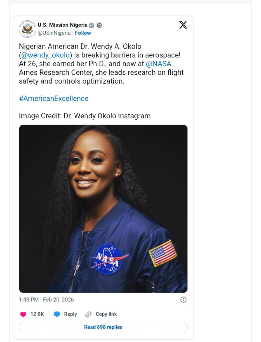“Nigerian American Dr. Wendy A. Okolo is breaking barriers in aerospace. At 26, she earned her PhD, and now at NASA Ames Research Center, she leads research on flight safety and controls optimisation,” the embassy wrote.