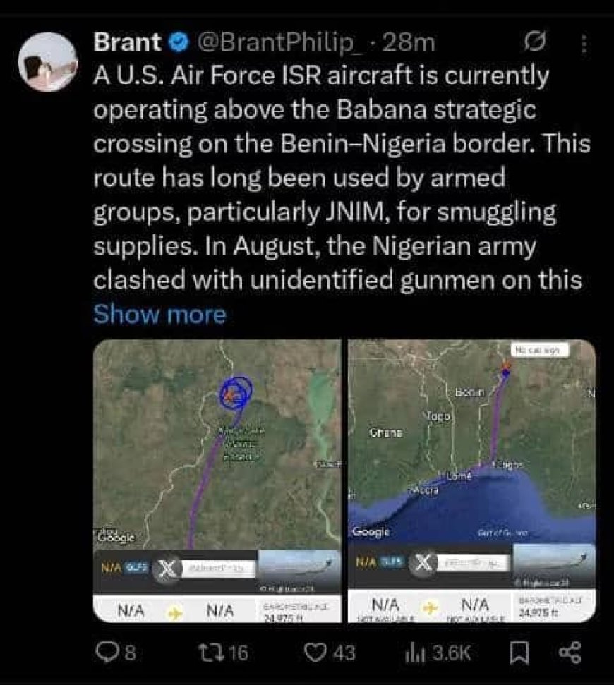 His words: “The United States Air Force ISR aircraft is currently operating above the Babana strategic crossing on the Benin-Nigeria border. This route has long been used by armed groups, particularly JNIM, for smuggling supplies. In August, the Nigerian army clashed with unidentified gunmen.